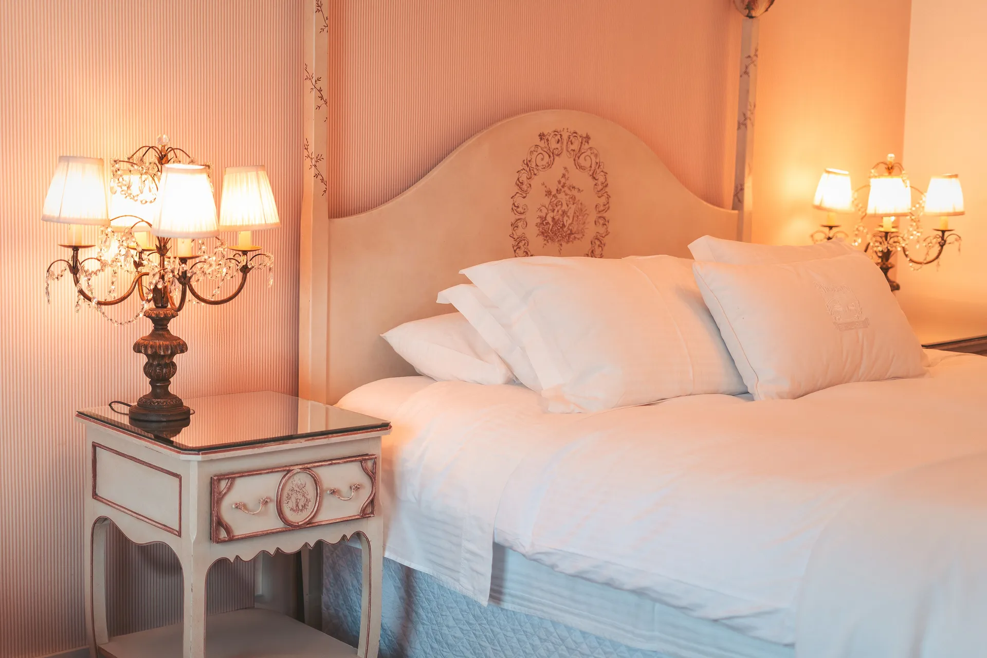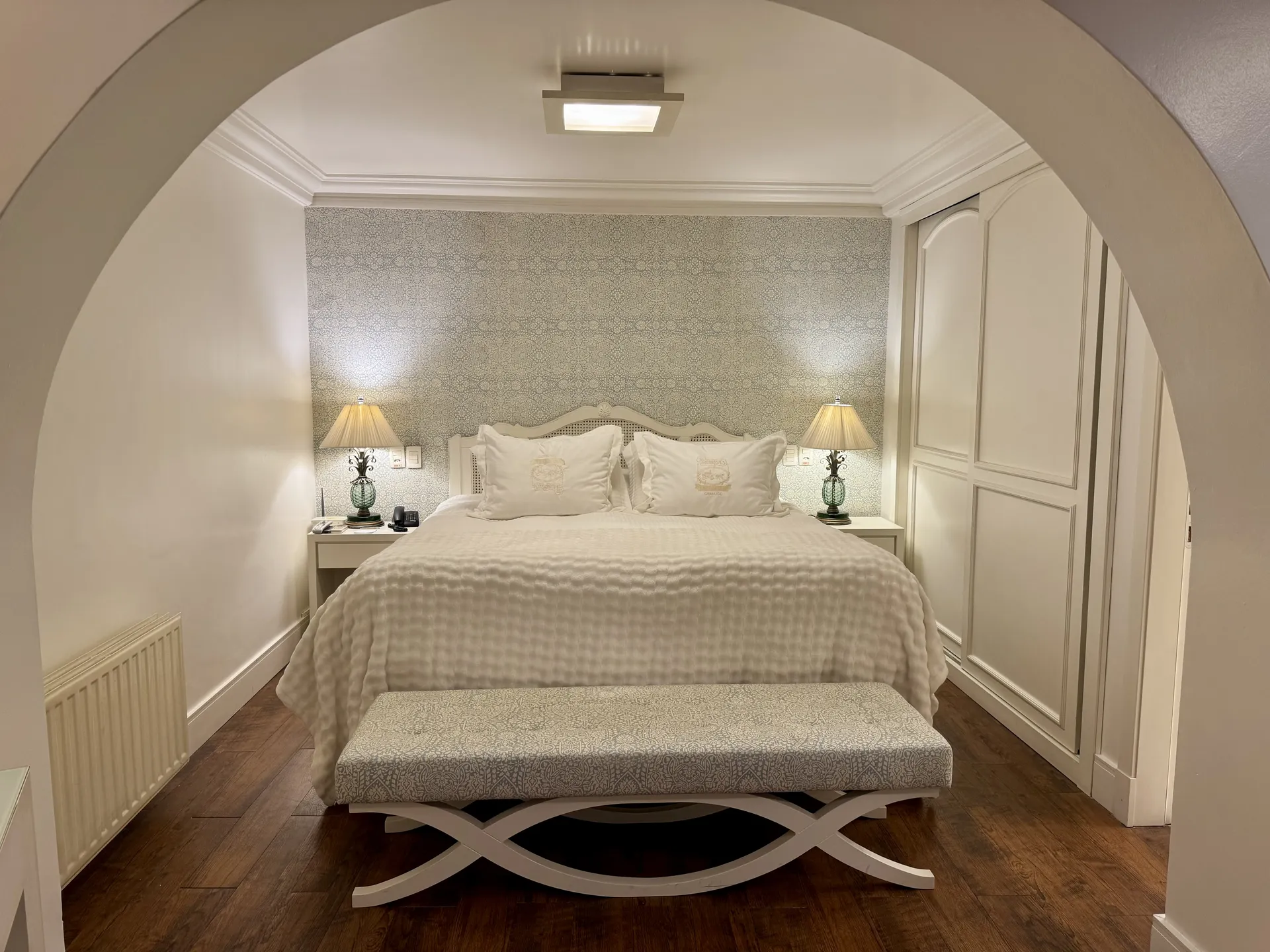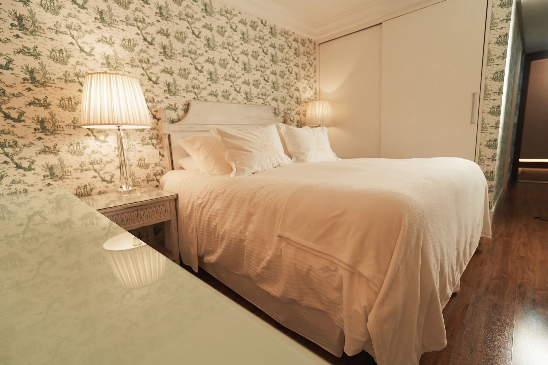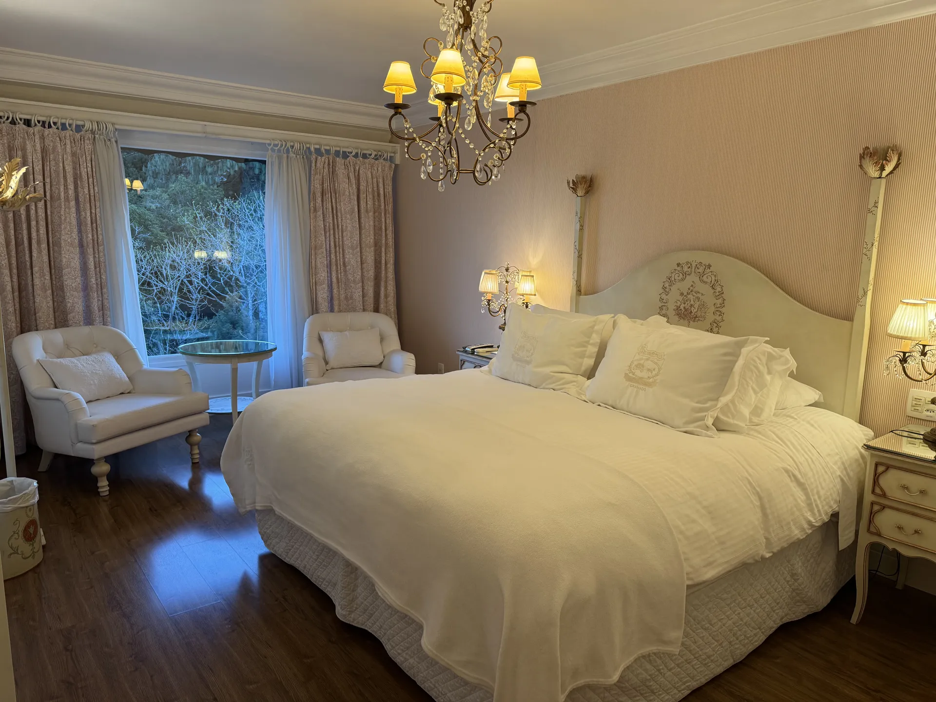 TEMÁTICO CRISTAL: com vista para o bosque e 26,68m² (21,72m² apto + 4,96m² banheiro), possui closet, móveis pintados à mão, lustre e abajures com pingentes de cristais, piso laminado, ar condicionado, cofre, calefação, Smart TV 42”, telefone, acesso à internet, cama de casal Box spring (1,80m x 2,00m), edredons de plumas de gansos e lençóis 100% algodão Trussardi. No banheiro, todo em mármore crema marfil, banheira de hidromassagem (190 litros), espelho de aumento, secador de cabelos, amenities, roupões e pantufas.