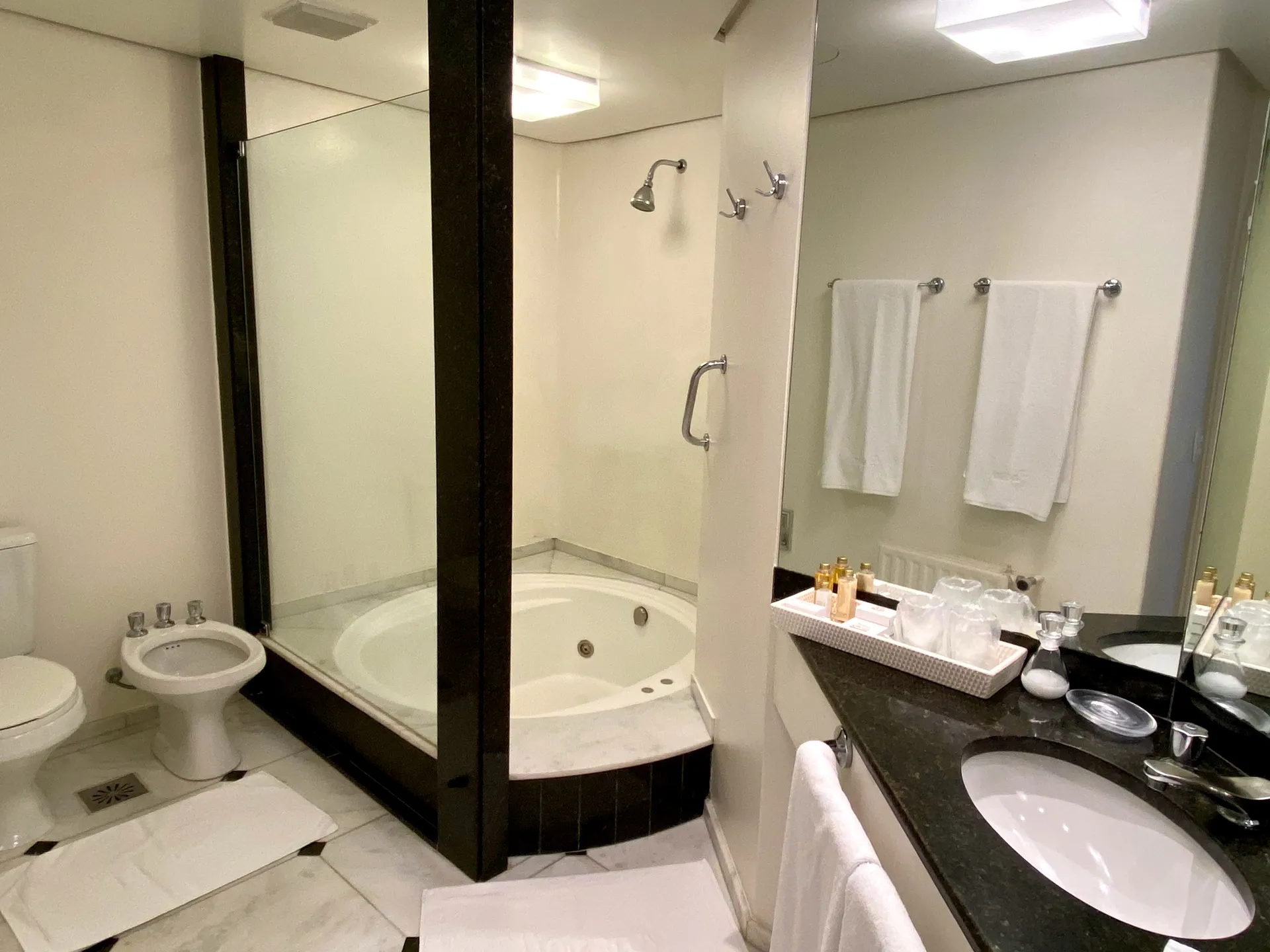 TEMÁTICO DO LAGO: com vista parcial para o Lago Negro e 31,70m² (23,65m² apto + 8,05m² banheiro), possui: piso laminado, ar condicionado, cofre, calefação, smart TV 42’, telefone, acesso à internet, cama de casal box spring (1,80m x 2,00m), edredons de plumas de ganso e lençóis 100% algodão Trussardi. Banheiro em mármore com banheira de hidromassagem redonda (190 litros), espelho de aumento, secador, amenities, roupões e pantufas.