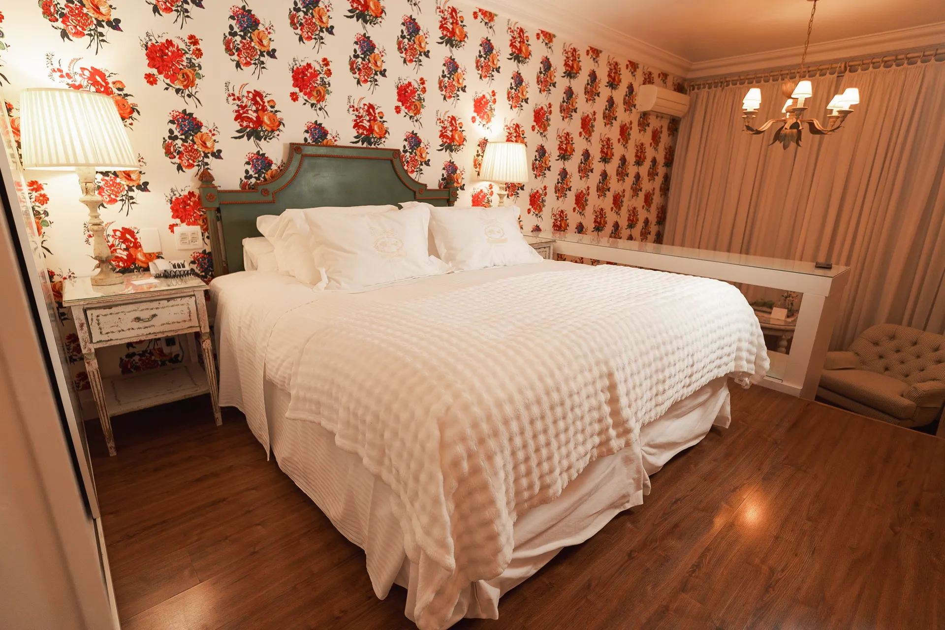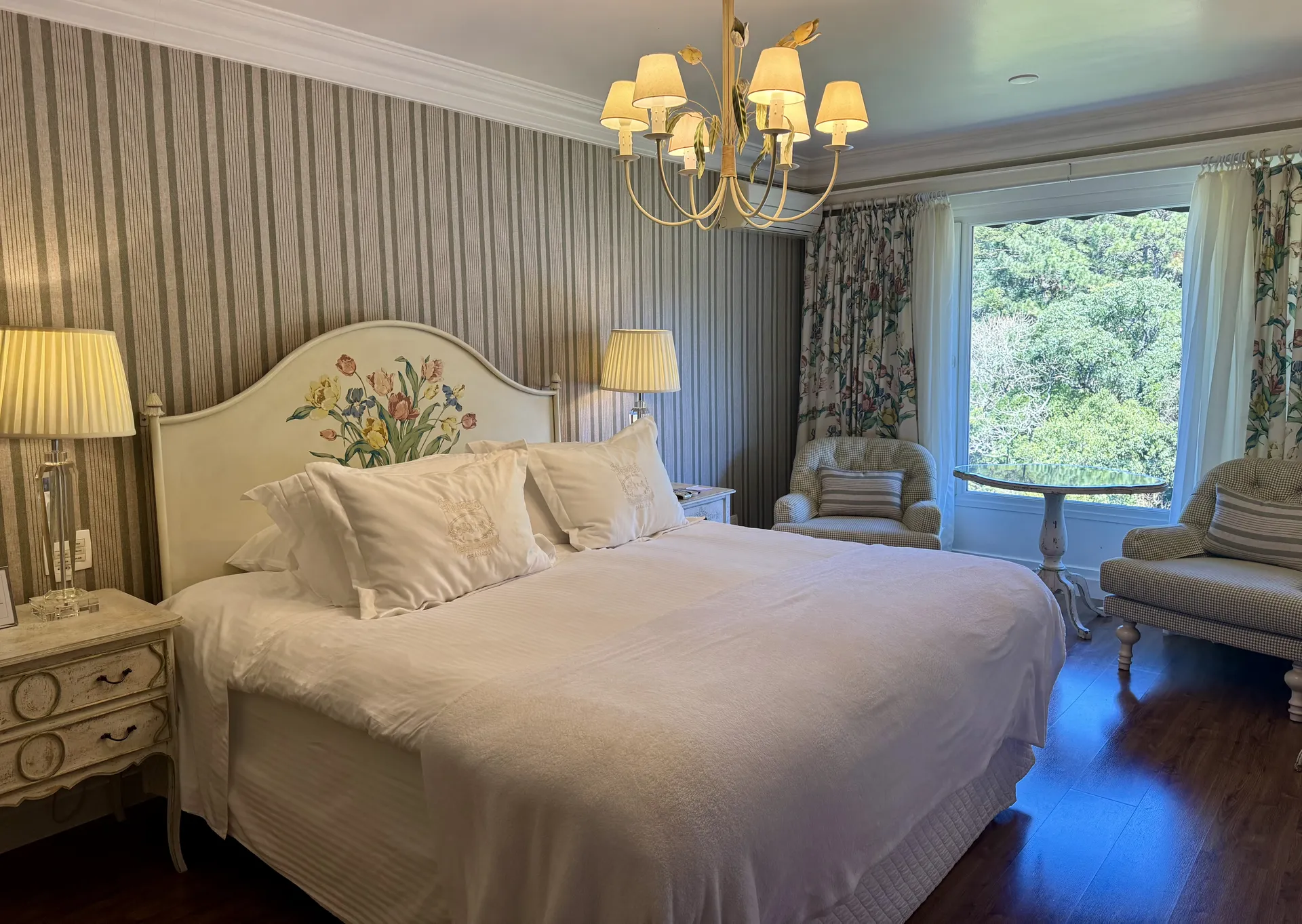 TEMÁTICO TULIPA: com vista para o bosque e 26,68m² (21,72m² apto + 4,96m² banheiro), possui closet, móveis pintados à mão, lustre com detalhes de tulipas, piso laminado, ar condicionado, cofre, calefação, smart TV 42”, telefone, acesso à internet, cama de casal Box spring (1,80m x 2,00m), edredons de plumas de gansos e lençóis 100% algodão Trussardi.No banheiro, todo em mármore crema marfil, banheira de hidromassagem (190 litros), espelho de aumento, secador de cabelos, amenities, roupões e pantufas